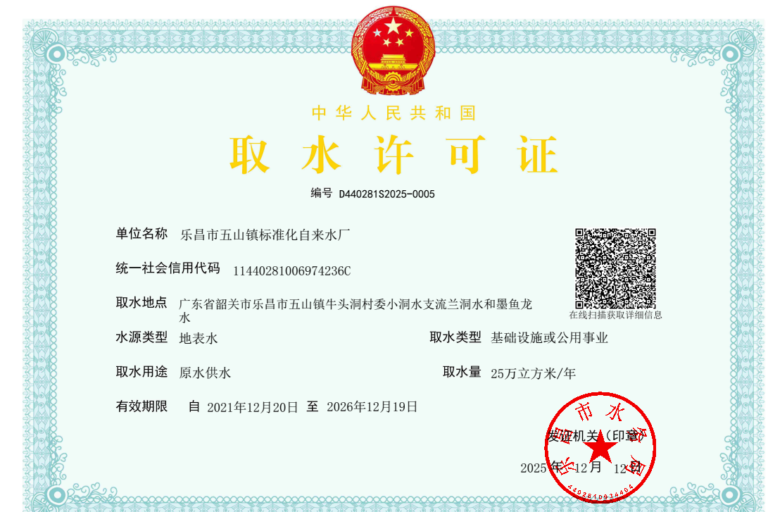 我局于2025年12月11日收到你水厂提出的《取水许可证》取水量变更申请。经审查,该申请符合《取水许可和水资源费征收管理条例》第二十六条规定的条件。根据《中华人民共和国行政许可法》第四十九条、《水行政许可实施办法》第三十九条 第二款规定,决定准予变更,同意你水厂(D440281S2025-0005)年取水许可量变更为25万立方米,其他内容不变,并据此重新换发《取水许可证》,原取水许可证收回作废。