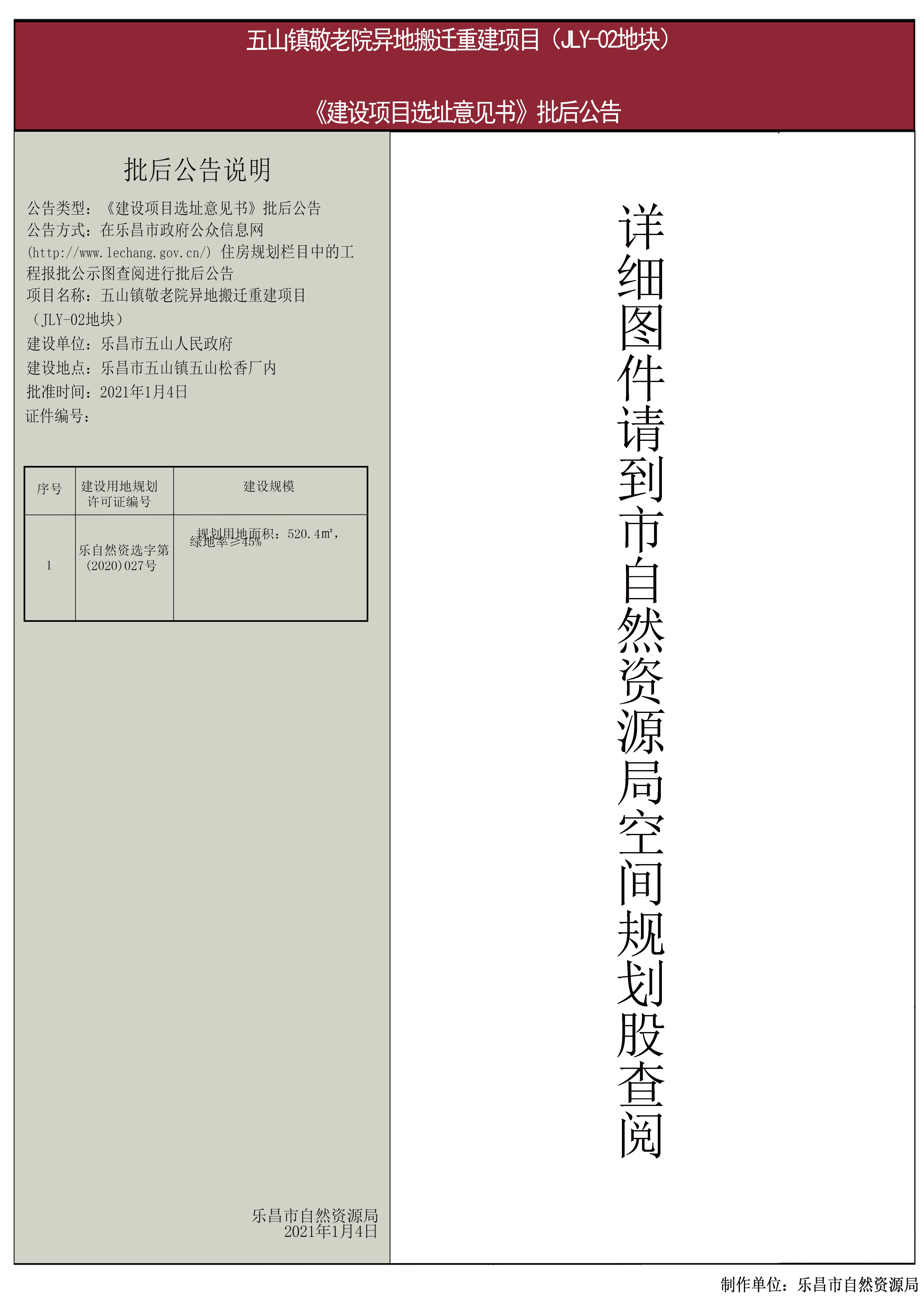 【批后公告】五山镇敬老院异地搬迁重建项目(JLY-02地块)《建设项目选址意见书》