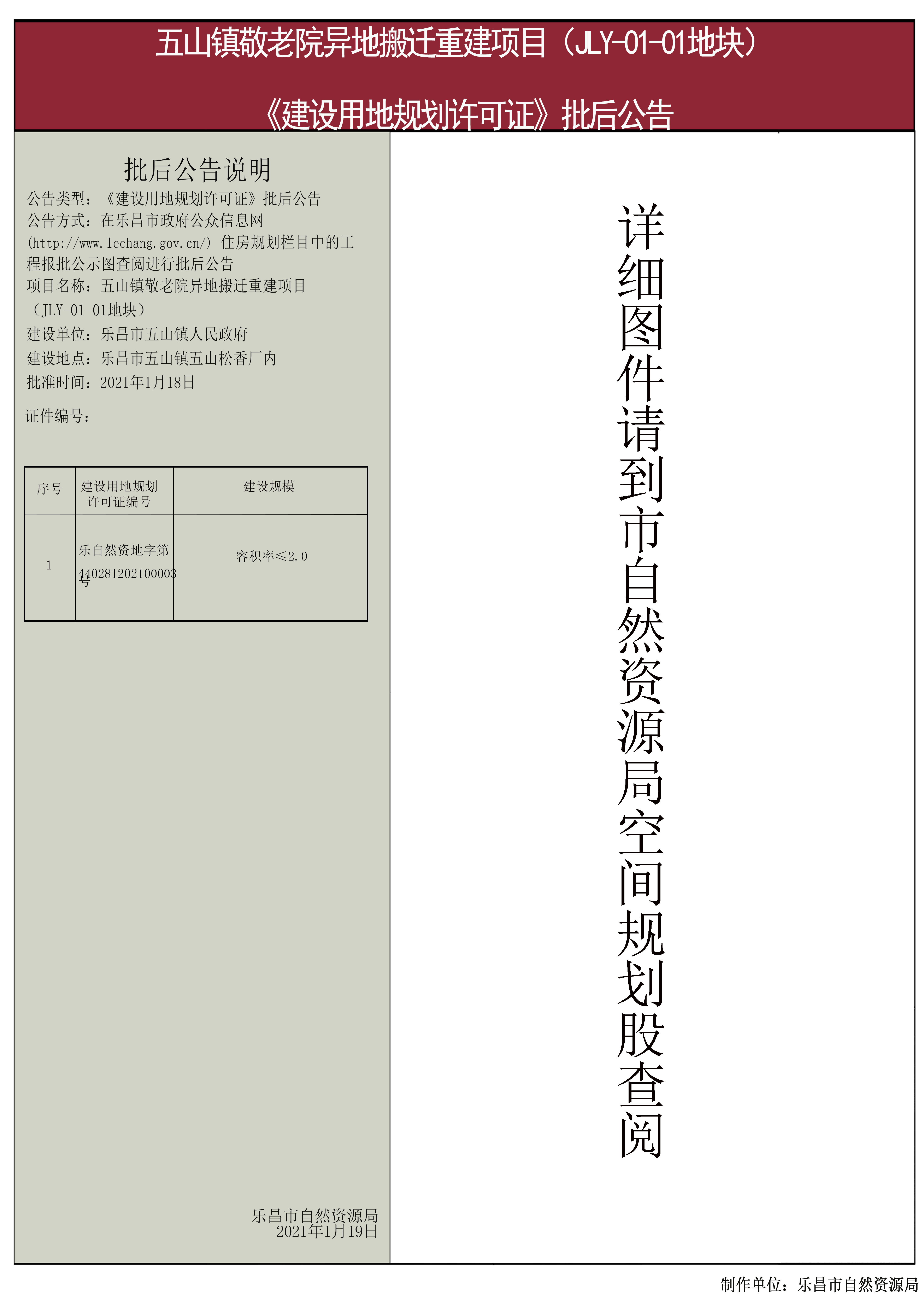 【批后公告】五山镇敬老院异地搬迁重建项目(JLY-01-01地块)《建设用地规划许可证》