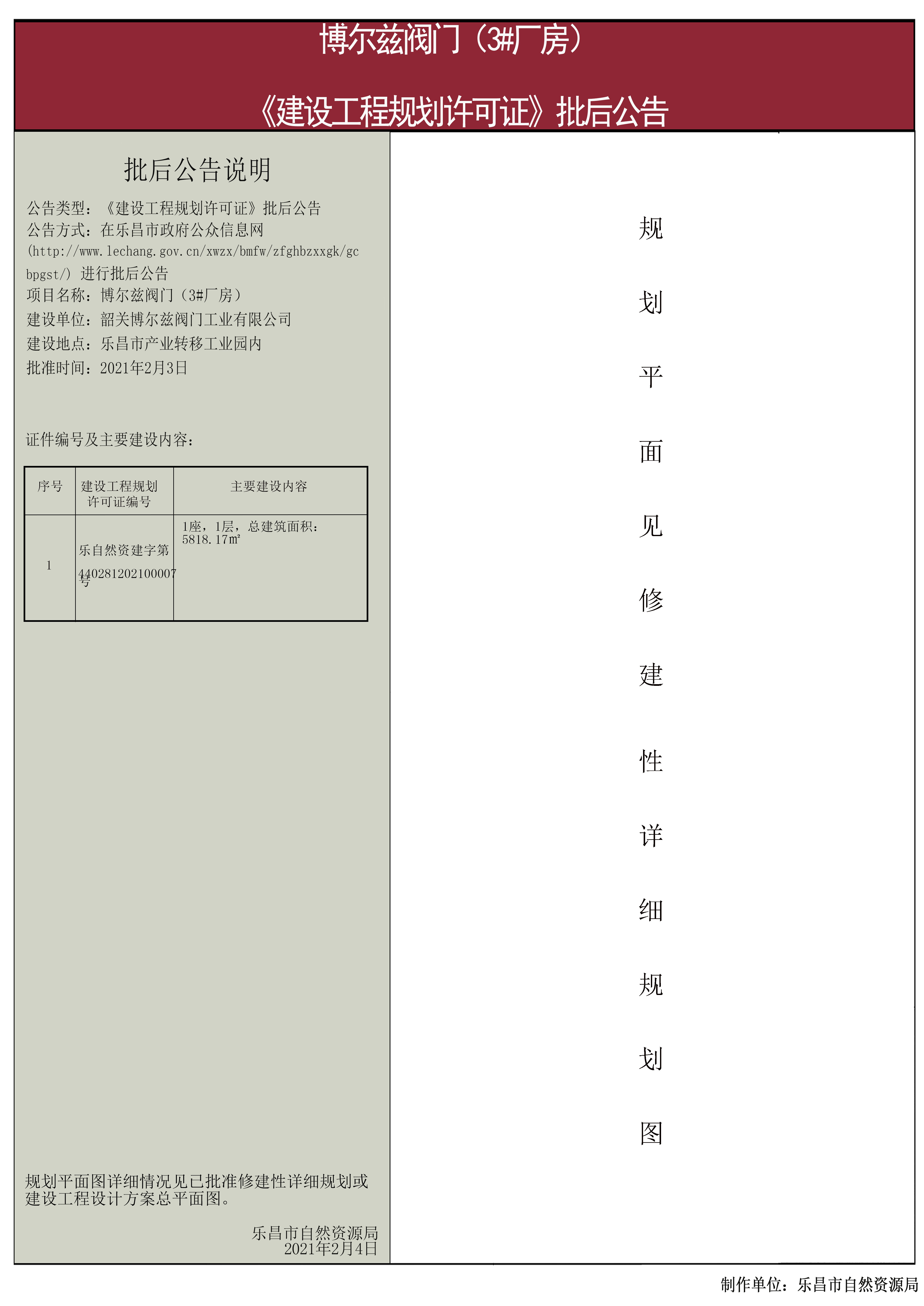 【批后公告】博尔兹阀门(3#厂房)《建设工程规划许可证》
