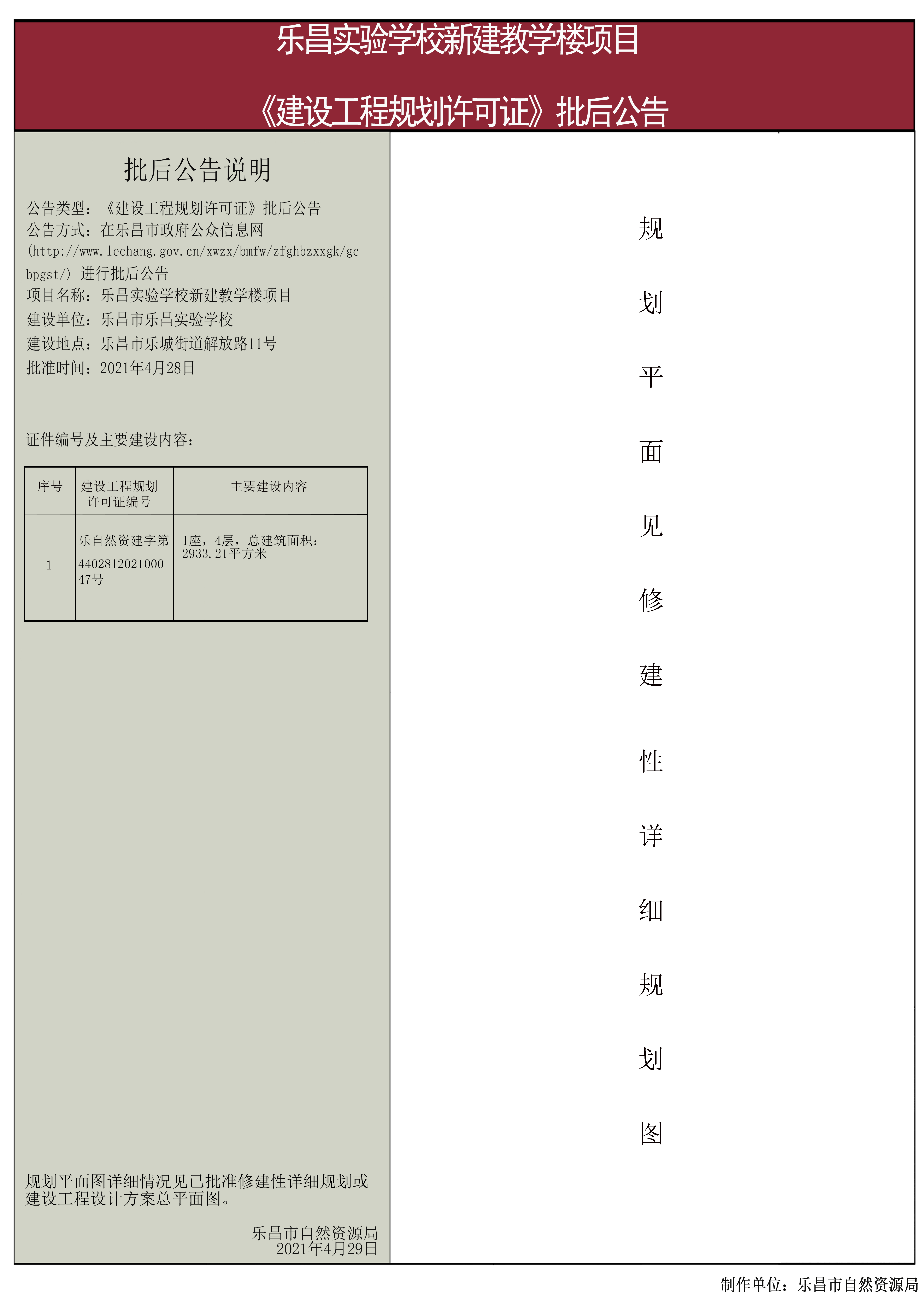 【批后公告】乐昌市乐昌实验学校新建教学楼项目《建设工程规划许可证》