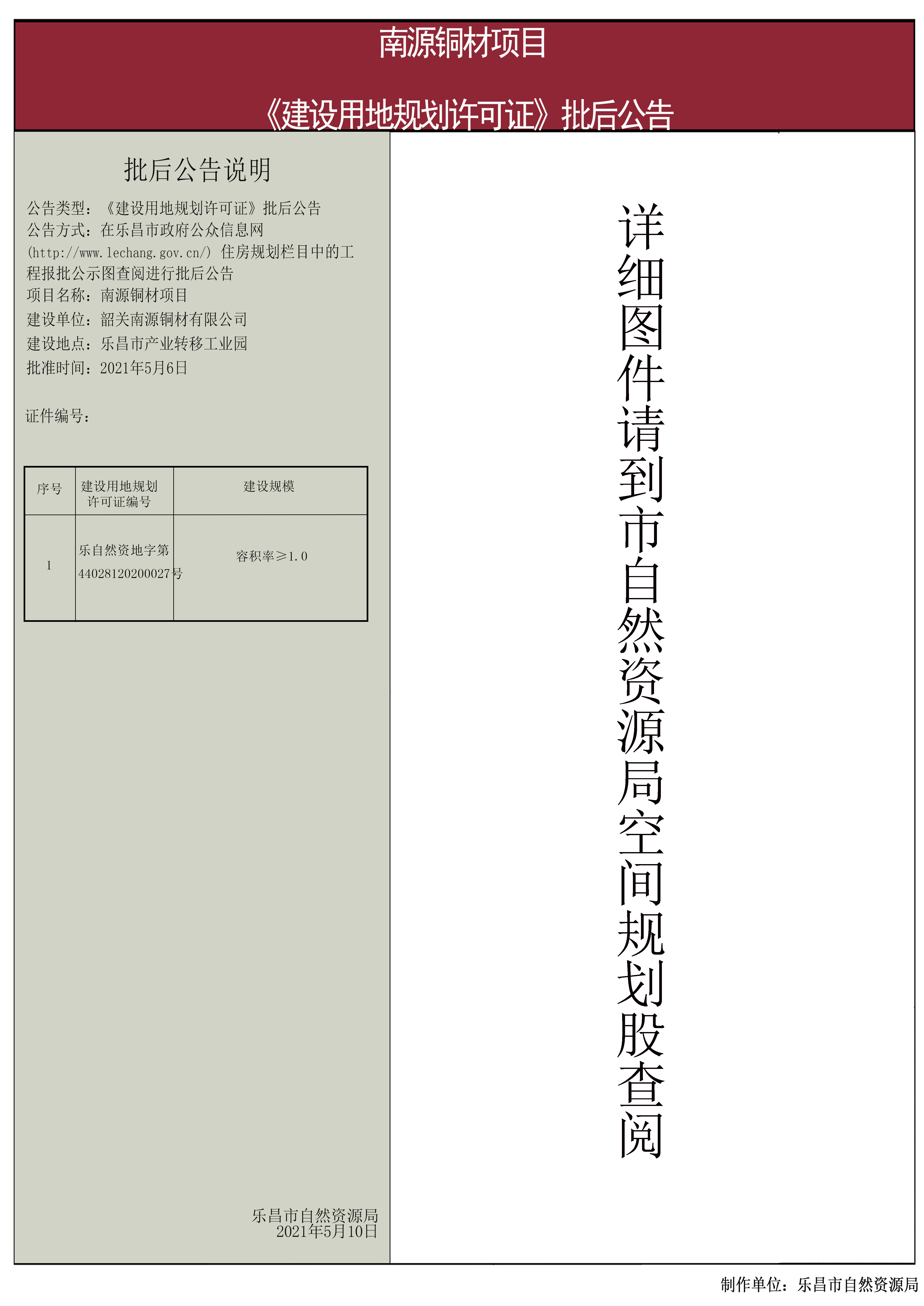 【批后公告】南源铜材项目《建设用地规划许可证》