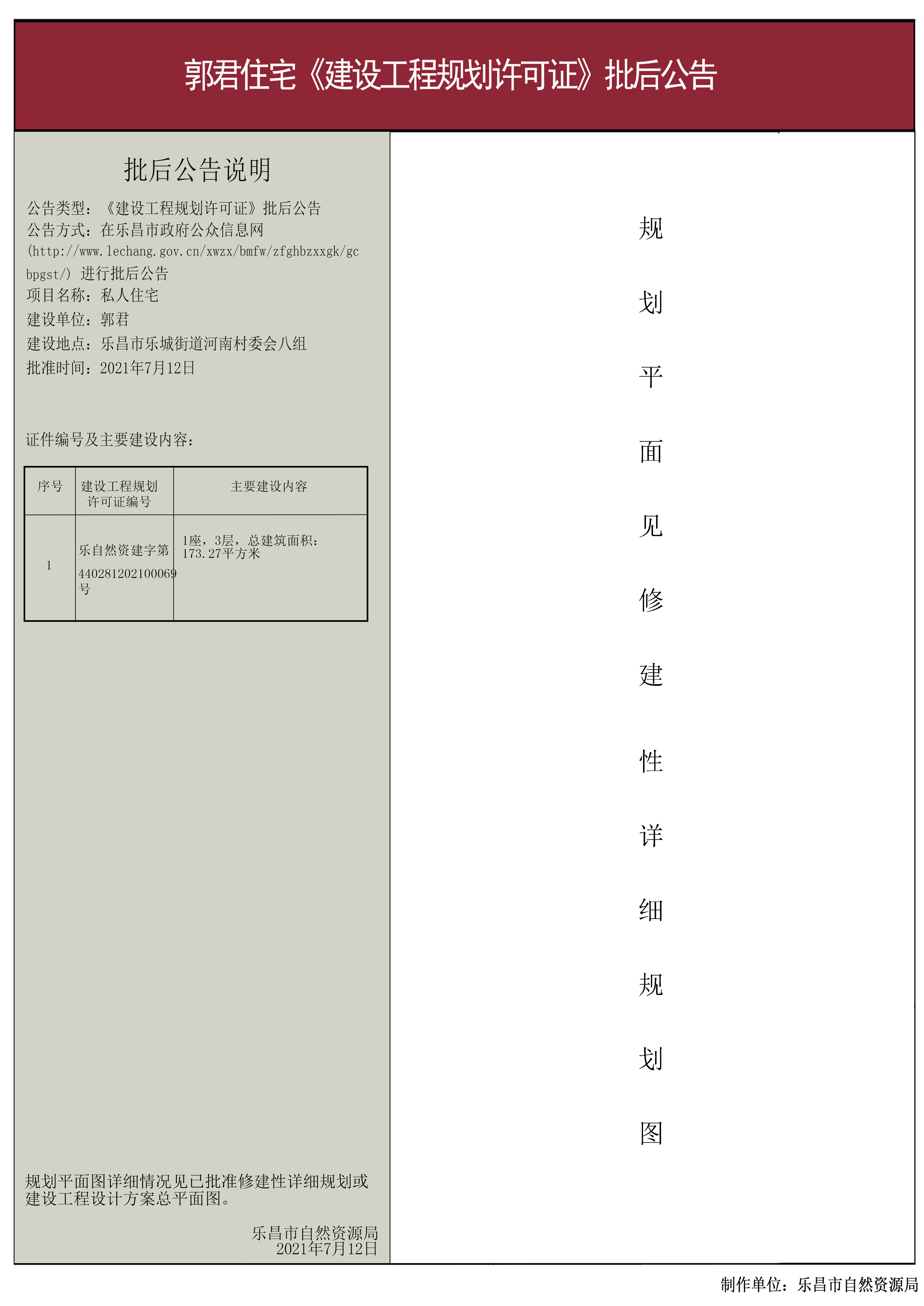 【批后公告】郭君住宅《建设工程规划许可证》
