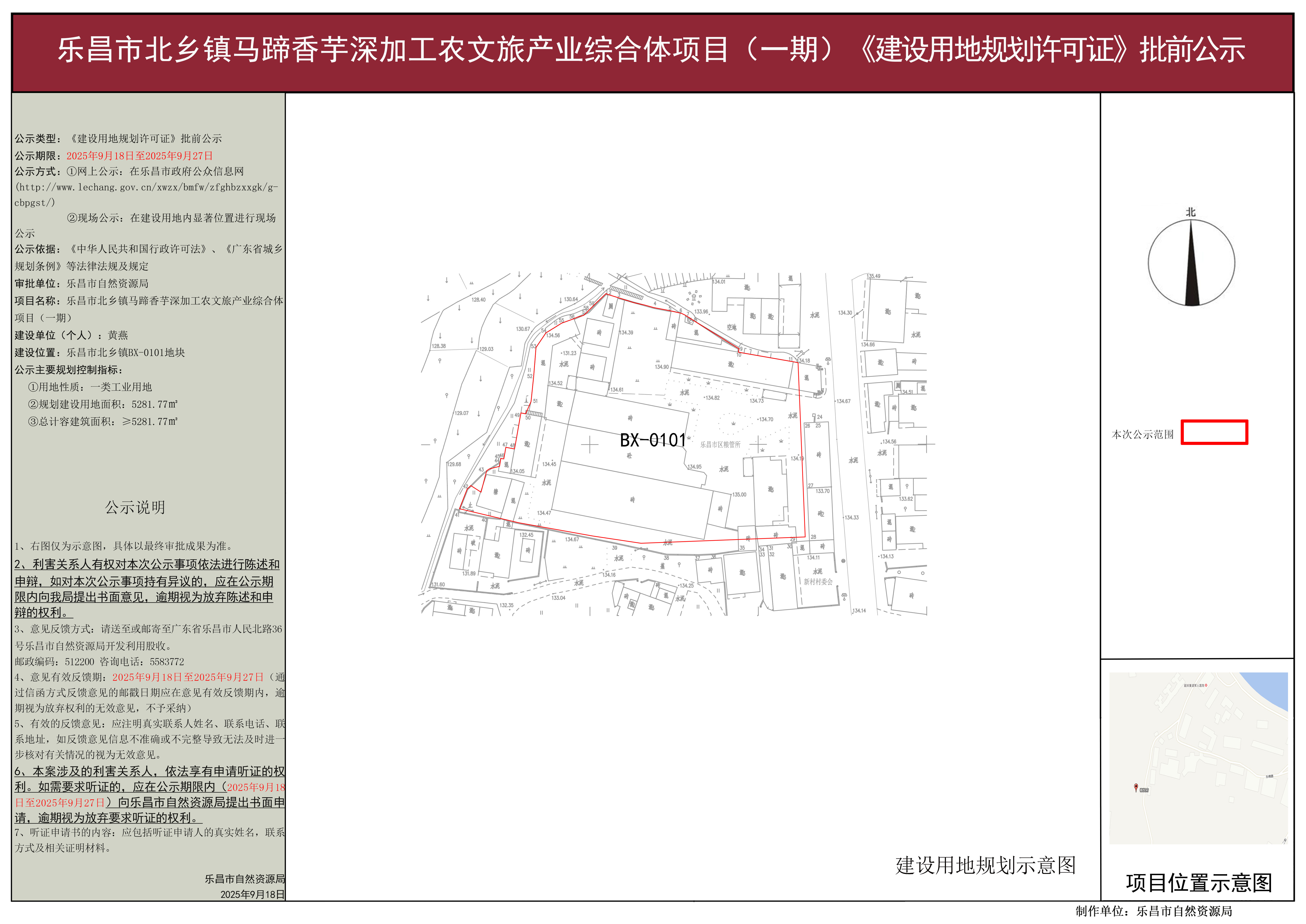 【批前公示】乐昌市北乡镇马蹄香芋深加工农文旅产业综合体项目(一期)《建设用地规划许可证》