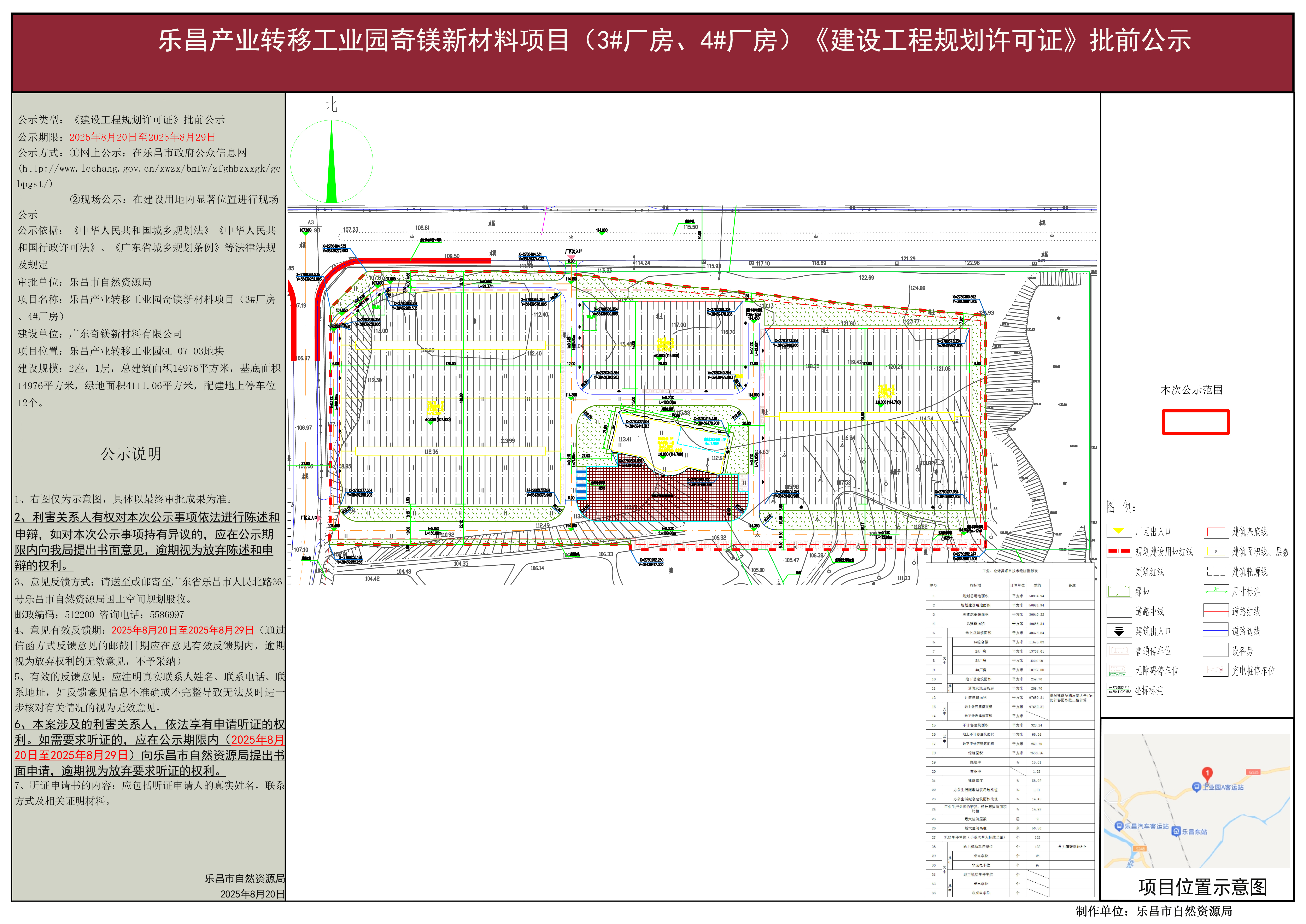【批前公示】乐昌产业转移工业园奇镁新材料项目(3#厂房、4#厂房)《建设工程规划许可证》