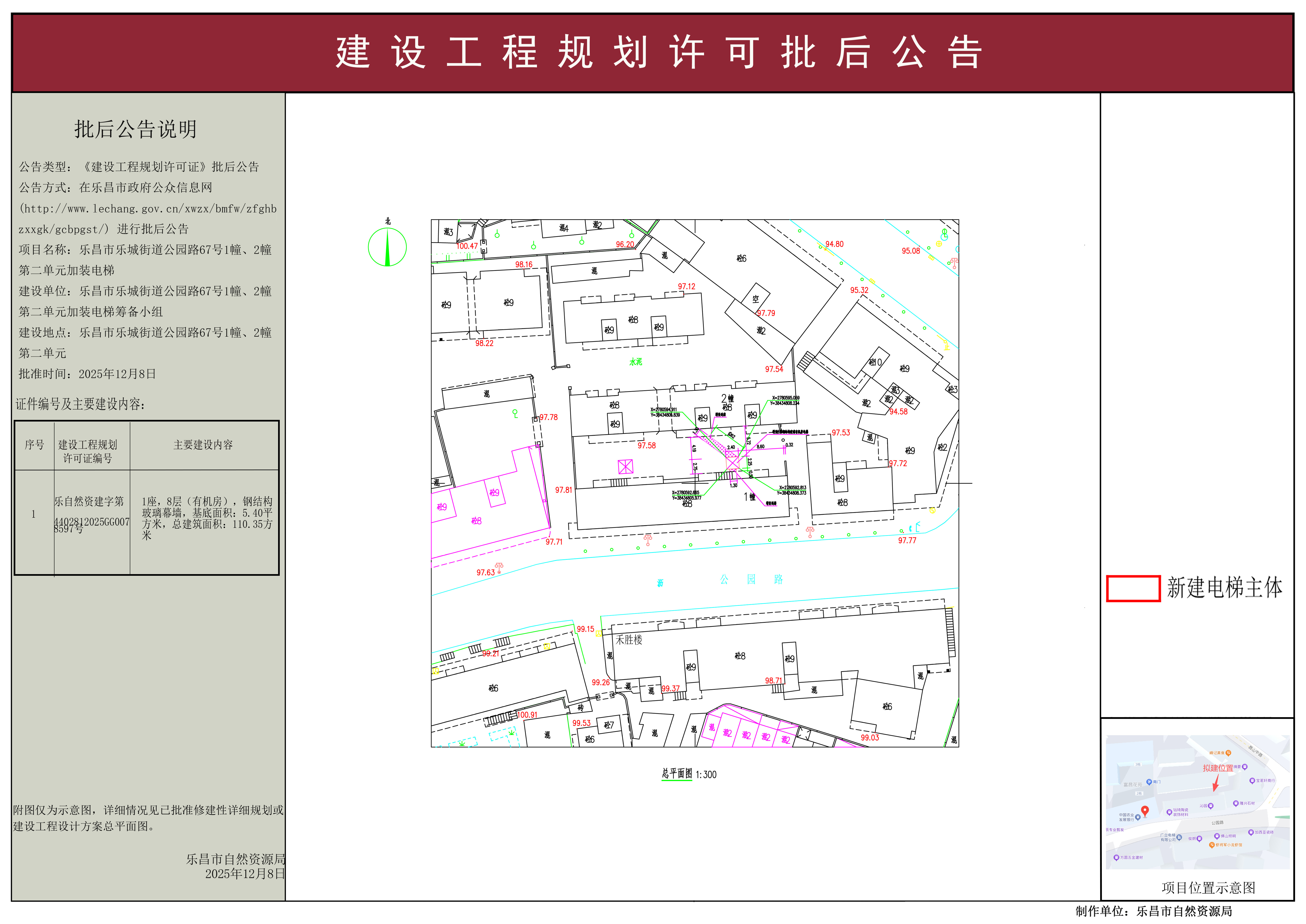 【批后公告】乐昌市乐城街道公园路67号1幢、2幢第二单元加装电梯《建设工程规划许可证》