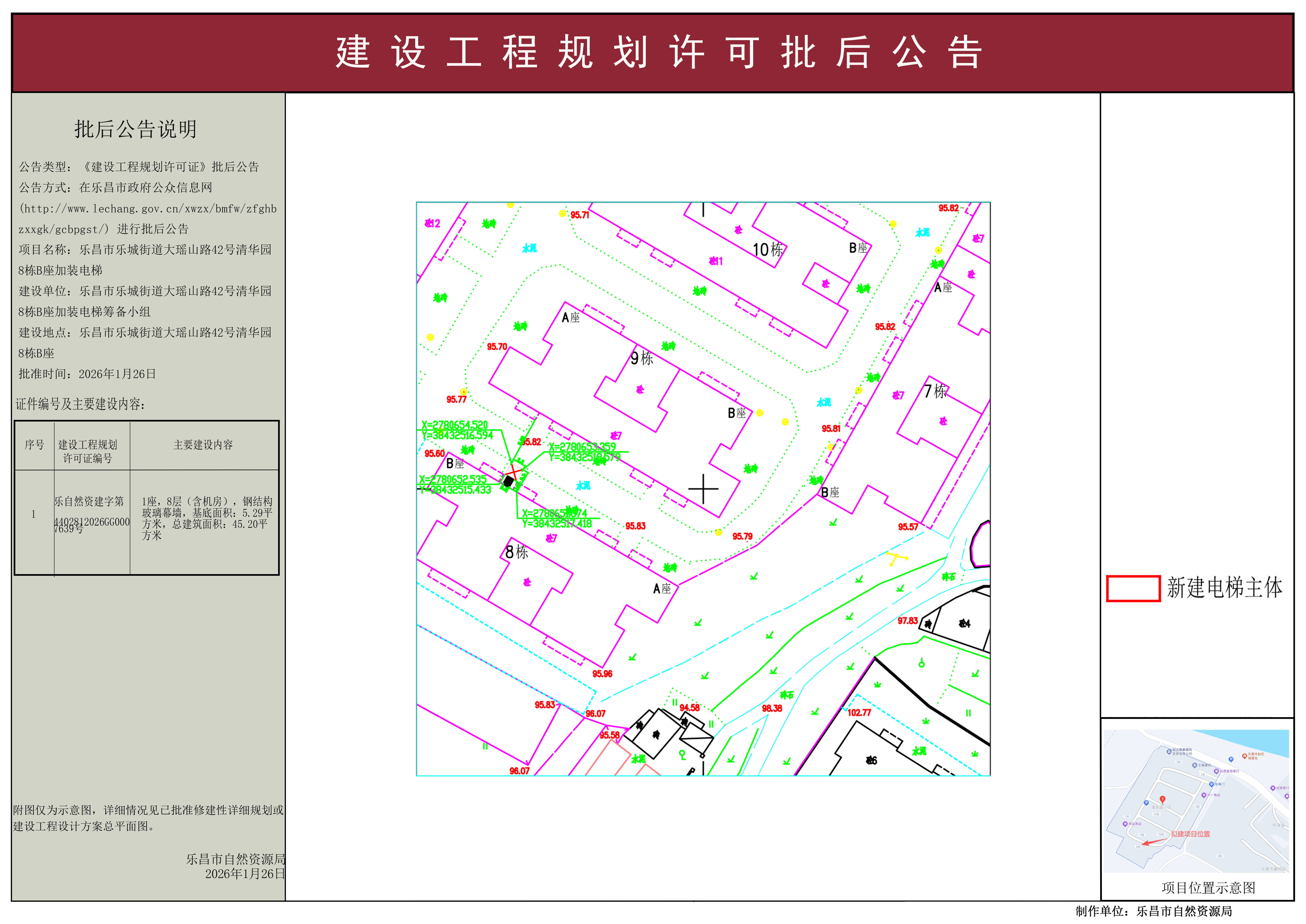 【批后公告】乐昌市乐城街道大瑶山路42号清华园8栋B座加装电梯《建设工程规划许可证》