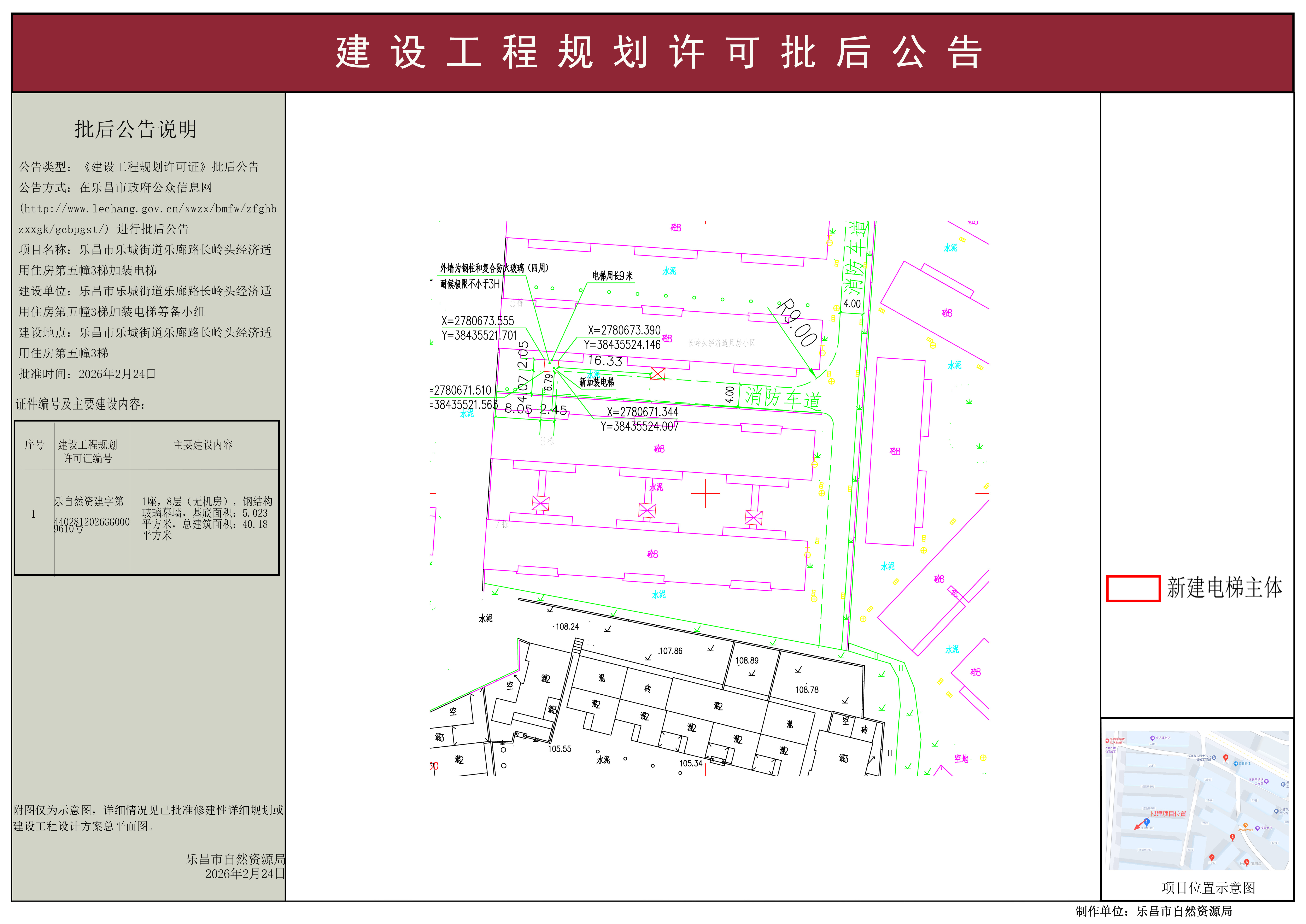 【批后公告】乐昌市乐城街道乐廊路长岭头经济适用住房第五幢3梯加装电梯《建设工程规划许可证》
